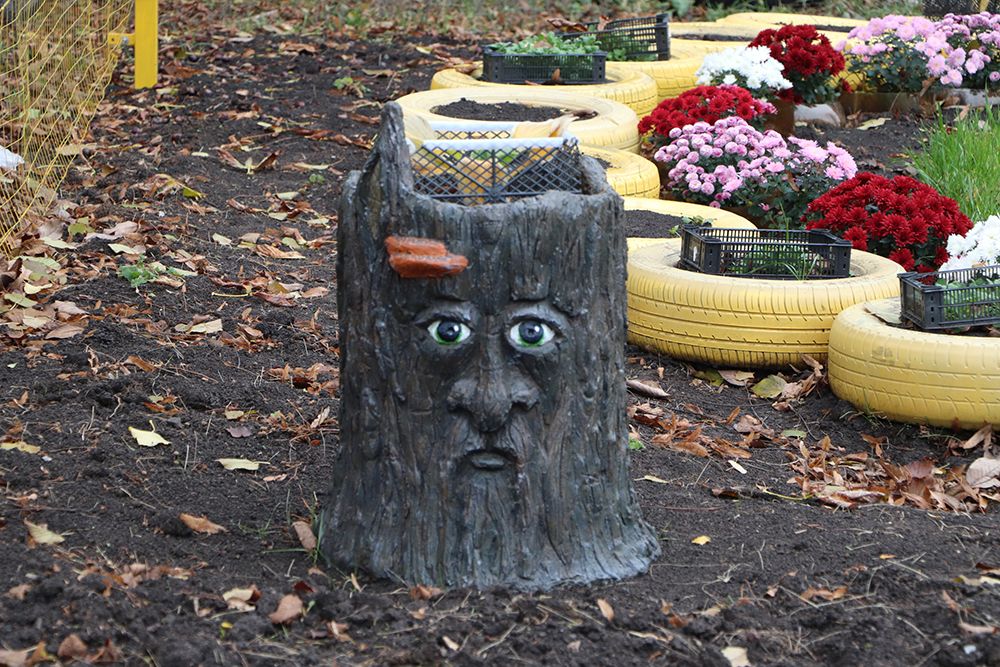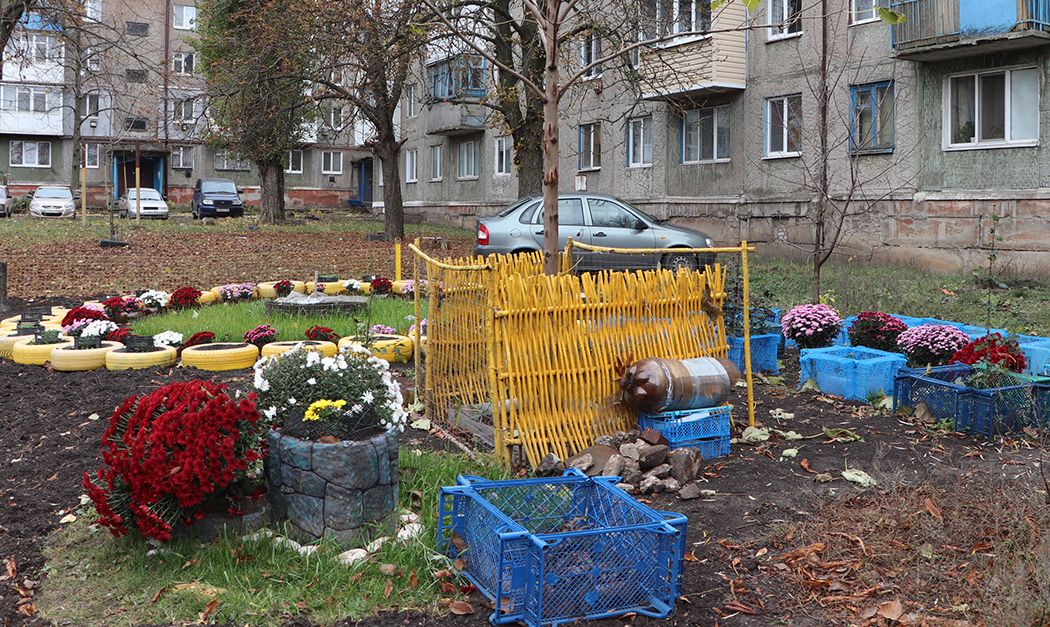 На подъезде к дому №28 вдоль дороги на большом пространстве господствует свалка. Но, если смотреть только направо, то глаз радует довольно редкое в нашем городе явление: среди осеннего скудного пейзажа на довольно большом ухоженном участке земли, играя красками, на клумбе растут многочисленные сорта цветов. Необычные кашпо, растения и деревья – все упорядочено. По периметру установлены ограждения, на которых укреплены светильники, они аккуратнейшим образом обрамлены корпусом из тонкой проволоки. Стоят домики для котов со шторками из жаккардовой ткани. Даже примитивные шины, выложенные по кругу, смотрятся замечательно. Наверное, потому, что они окрашены в яркожелтый цвет настолько идеально, что комар носа не подточит.