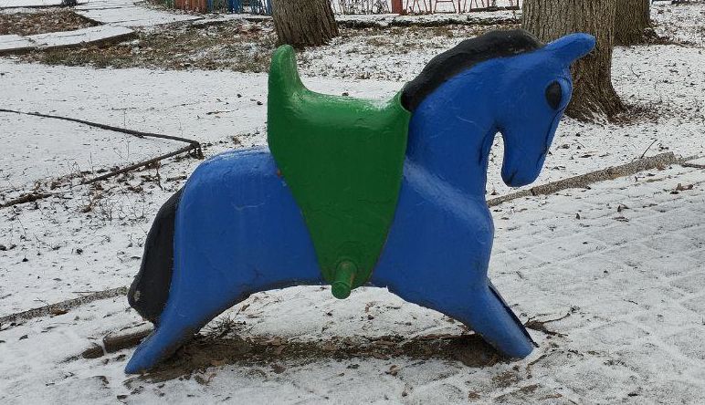 В Шахтерском сквере нашли тележку, но запряжен в нее рак, но никак не конь. И вот наконец-то удача! В одиноком зимнем парке мы встретили малюсенькую синюю лошадку с зеленым седлом для самых маленьких свердловчан. Чтобы малыш не упал, она стоит неподвижно, имеет удобные подножки, а вот глаза – такие же темные и глубокие, как у Стрелки.