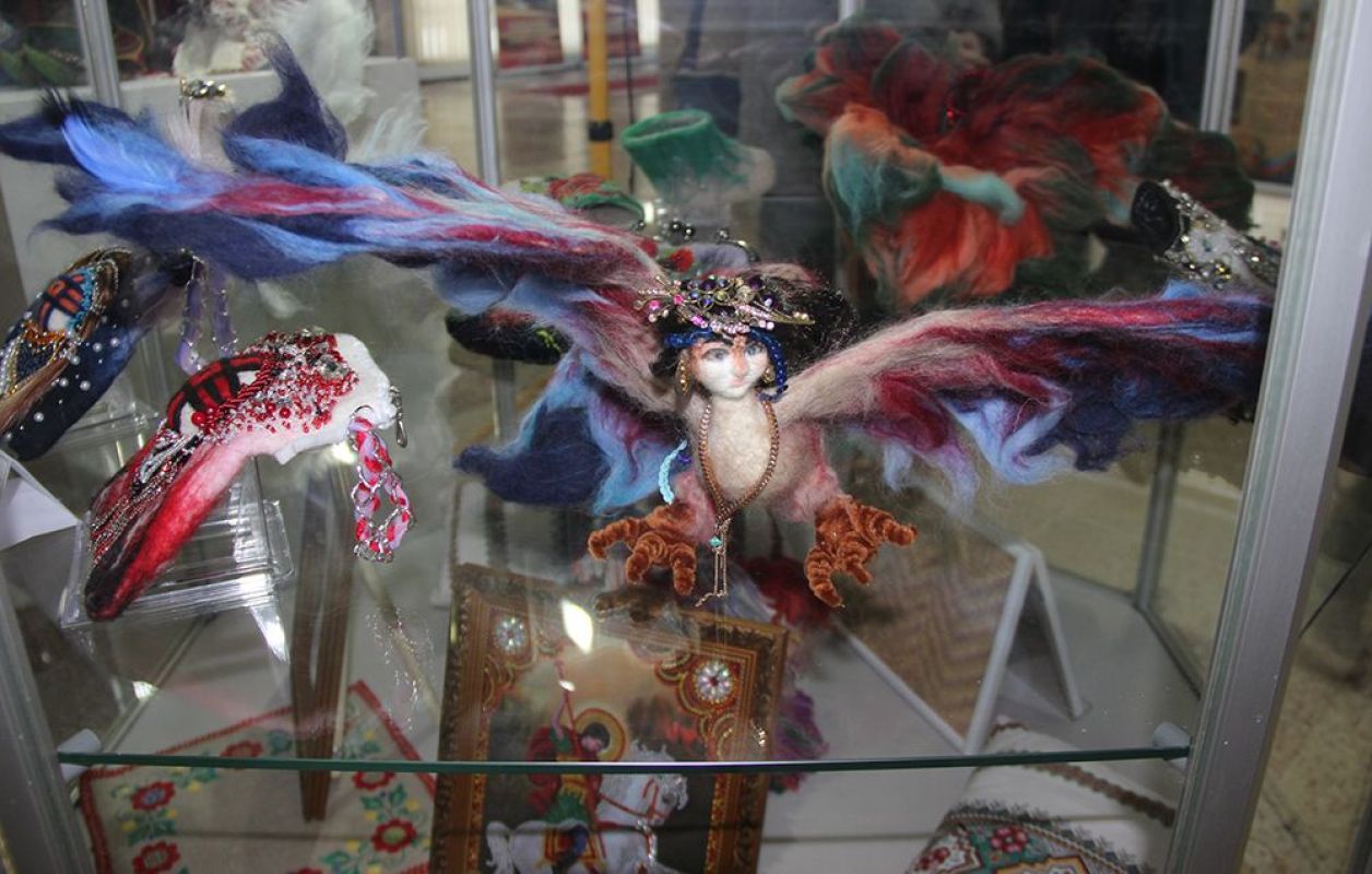 Рядом с ангелами Зинаиды Георгиевны царила другая мифическая атмосфера. На стенде гордо воцарился Гамаюн, созданный Мариной Билейчук. Марина Дмитриевна – художник-оформитель по образованию, всю жизнь работала в разных техниках. Творчество сопровождало ее с самого детства: дома всех приучали шить, вышивать, осваивать ремесла, и жизнь постепенно превратилась в сплошное творчество. Гамаюн – ее самая первая и самая душевная работа из шерсти. Птица родилась в один из самых трудных периодов жизни мастерицы и стала для нее символом самой жизни. В славянской мифологии это вещая птица, которая видела рождение земли, видит грядущее и криком предупреждает о важных событиях. Эту символичную птичку Марина Дмитриевна бережет особенно трепетно.