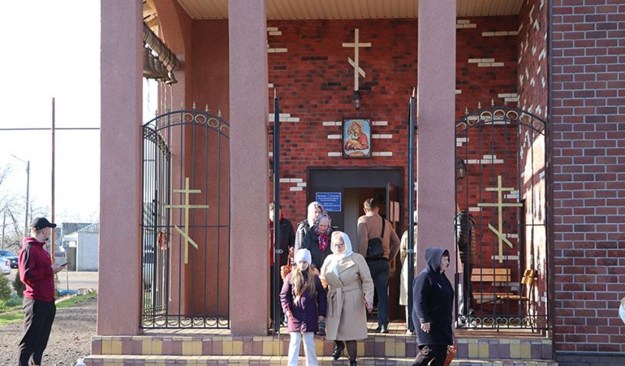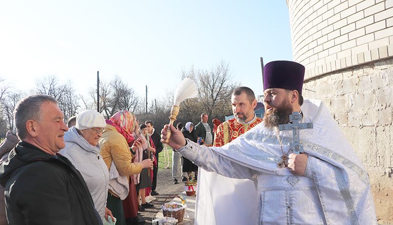 Во дворе храма Архистратига Михаила в Червонопартизанске к 10 утра осталось не так много людей, но здесь продолжали звонить в колокола, а настоятель с радостью встречал каждого прибывшего, щедро окропляя их вместе с корзинками святой водой.