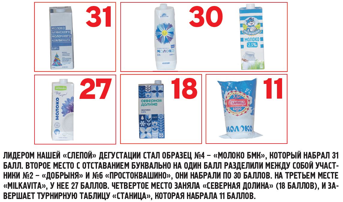На поверхности «Северной долины» сформировались пятна жира. Но структура молока не изменилась. «Добрыня» также порадовал жирными пятнами на поверхности и сладким вкусом. Структура превратилась в легкую суспензию. Больше всего жира всплыло на поверхность у «Milkavita», но сильно проявился соленый вкус. На молоке «БМК» и «Простоквашино» жир не отделился, но и вкус, кроме кислоты, сильно не изменился. «Станица» особых изменений не претерпела, просто хлопья превратились в тугой сгусток, выделилась сыворотка, а вкус жира стал похож на старое сливочное масло.