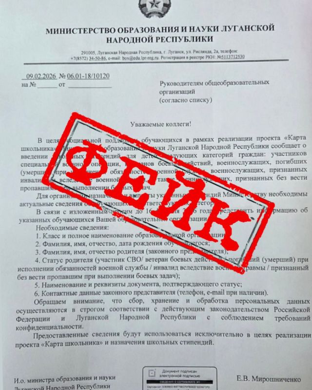 В последние дни злоумышленники активизировали рассылку поддельных материалов, якобы исходящих от Министерства образования и науки Луганской Народной Республики. Цель таких действий — дестабилизировать обстановку, вызвать недоверие к власти и расколоть общество ложными сведениями.