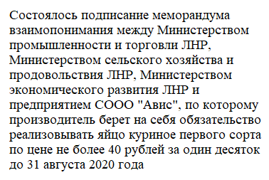 Птицефабрика (СООО) "Авис" в связи с заключенным меморандумом с министерствами ЛНР будет продавать яйца не дороже 40 руб. за один десяток до 31 августа. Об этом рассказали в Минпромторге ЛНР.