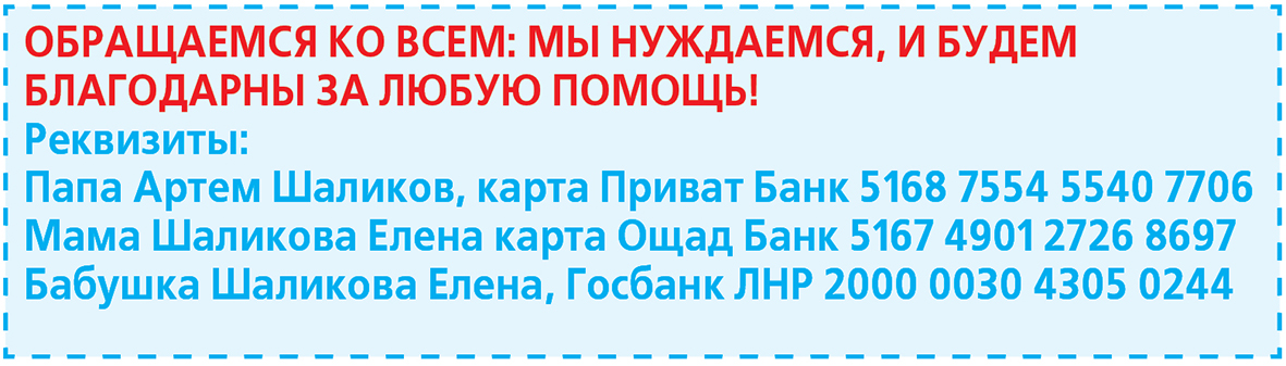 До этого времени мы выкручивались сами: очень помогают друзья, родственники, знакомые. Но теперь наших средств катастрофически не хватает. Одна «высокодозка» обошлась в сумму больше 100 тыс. гривен.