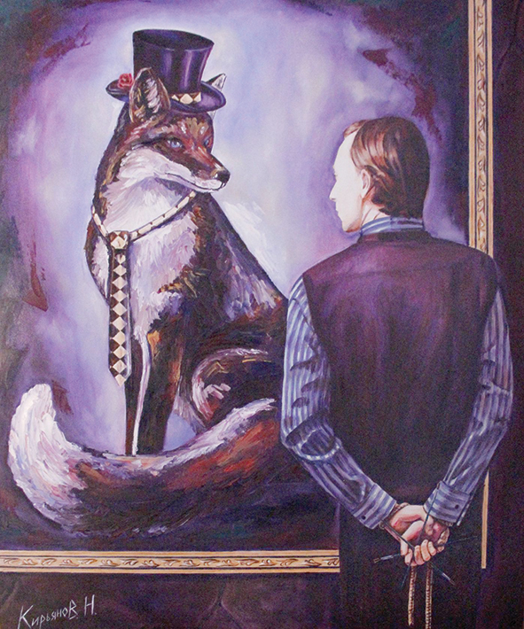 - В принципе, художник не должен объяснять картину. Но на этой, например, лисица обозначает самого художника: отображает мое творчество. Веревка, которая обвязывает руки, держащие кисти – как символ того, что автор привязан к своему делу.