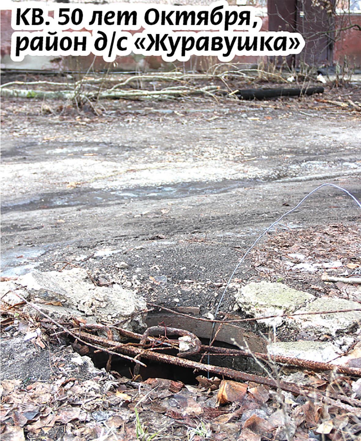 В редакцию пришла молодая мамочка с фотографией открытого канализационного колодца, накрытого разрушенной арматурой. И это не отдаленная улица города – люк расположен в шаговой доступности от д/с «Журавушка», куда она каждый день водит ребенка. Сваренная металлическая основа из прутов держит на себе небольшие куски бетона. Как выяснилось позже, на небольшом «пятачке», расположенном по дороге к саду, сразу несколько таких вот «ловушек». Одна накрыта куском транспортерной ленты, но без деревянного каркаса. Другой люк просто прикрыт плитой. Относительно большая дыра зияет и проецирует потенциальную опасность. Местные жители утверждают, что этот колодец связистов…