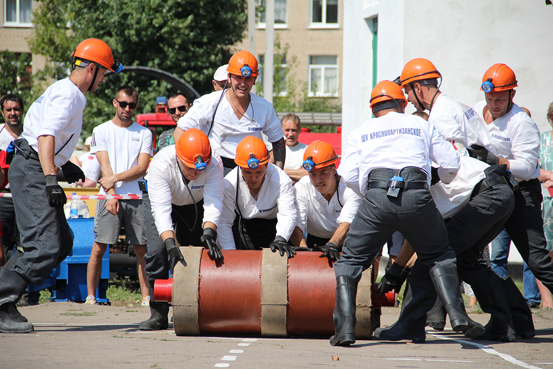 За основу конкурсов были взяты самые распространенные навыки шахтерской профессии. Первой задачей команды было загрузить вагонетки щебнем. Под крики: «Давай! Давай!» мужчины вовсю махали лопатами, да так, что пыль стояла столбом, а грохот был, как на настоящем производстве. Как только около вагонетки остались остатки щебня, ребята собирали его вручную: сгребая в горсть, как семечки. Так, в первом конкурсе лучшими грузчиками оказались горняки ШУ «Ясеновское».