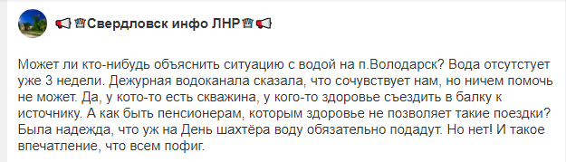 Согласно обращению местного жителя в группе «Свердловск инфо ЛНР» в «Одноклассниках», вода в посёлке отсутствует уже третью неделю.