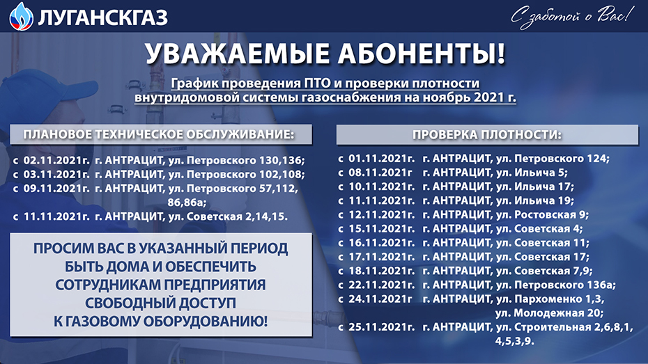 Специалисты госпредприятия «Луганскгаз» в ноябре проведут проверку газового оборудования у абонентов Антрацита.
