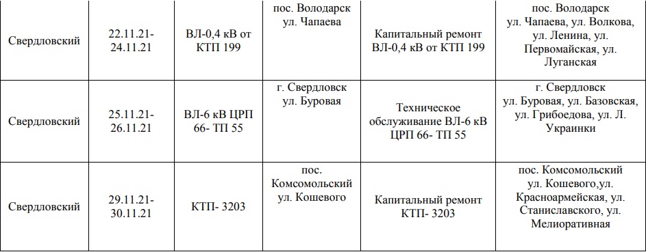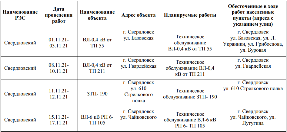 Где в Свердловске и районе будут отключать свет в ноябре?