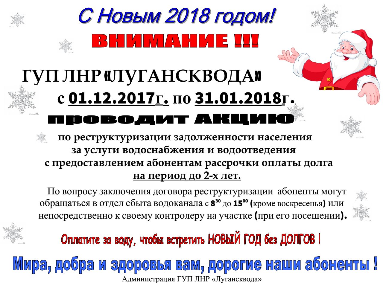 Уникальная возможность встретить Новый год без долгов появилась у потребителей ГУП ЛНР "Лугансквода". Так, благодаря программе реструктуризации задолженности населения за услуги водоснабжения и водоотведения граждане могут в течение 2 -х лет оплатить долг частями.