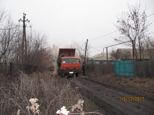 Неожиданно 14 декабря заявителям позвонили из УЖКХ: «Завтра будут сыпать улицу, будьте на месте!». Утренний звонок специалиста ККП Сергея Ефимова о том, что дорожная техника стоит где-то в районе ул. Серова, внес небольшую сумятицу – журналисту «ТГ», который решил зафиксировать развитие событий, пришлось с Филатова вместе с заказчиками мчаться на Серова, чтобы показать то самое место, которое тоже требует подсыпки. Но по прибытии решено все-таки начать с Филатова, так что пришлось садиться в КАМАЗ, и ехать в пункт назначения. Однако вскарабкаться в грузовую машину, где нижняя ступень находится намного выше уровня колена, корреспонденту «ТГ», без диплома окончания циркового училища, оказалось делом непростым. На третьем безуспешном подпрыгивании, чьи-то сильные руки подхватили сзади, и закинули меня в кабину, следом без церемоний громко захлопнулась дверь. Приезжаем в пункт назначения: водители КАМАЗов Евгений Ласица и Александр Руденко, а также водитель грейдера Валентин Вдовенко оценивают объем работы.