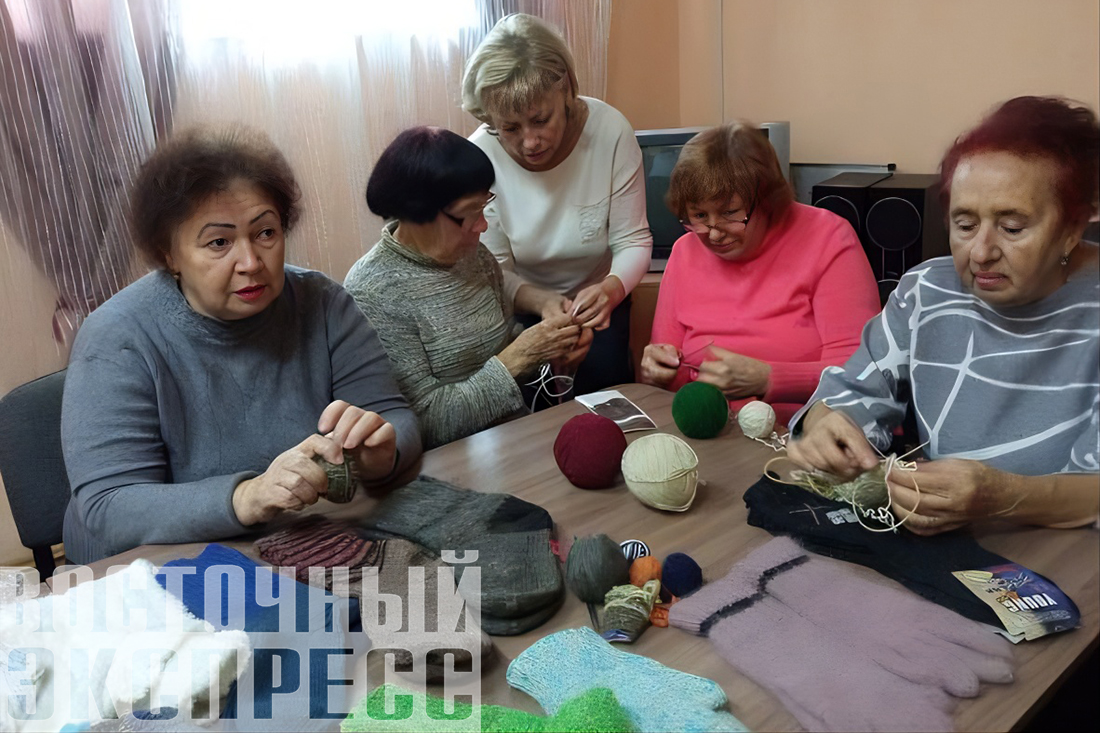 Активистки центра, среди них Валентина Ивановна Вершинина, Тамара Филипповна Боярчук, Екатерина Ивановна Нагуляк, Татьяна Ивановна Труфанова, София Сахиевна Агейчик, Нина Ивановна Топор – люди продвинутые, пользуются гаджетами и соцсетями. Там и увидели, что объявлена всероссийская акция «Подари тепло солдату». И вот уже пошли в ход старые свитера и шарфы, их распустили и связали сразу 20 пар теплых носков. При этом выяснилось, что вязать те же носки умеют далеко не все, кто хотели бы помочь. Быстро организовали занятия, привлекли молодых работниц центра – и передали для бойцов порядка 40 пар носков. Не обошлось и без маленьких казусов. Надежда Петровна Янцевич связала «следочки» с цветочками. Все посмеялись, когда увидели. А она рассудила так: на фронте ведь есть и женщины, им тоже должно быть тепло. А в цвет еще связала и теплые воротнички, как на свитерах, которая полностью закрывают шею. Вязать носки для фронта женщины продолжают и сегодня.