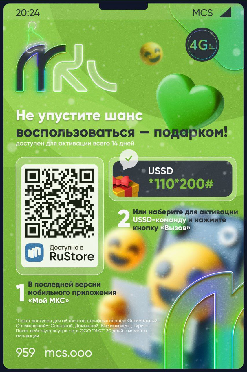 Чтобы активировать пакет, необходимо обновить приложение «Мой МКС» до последней версии, либо набрать USSD команду *110*200#