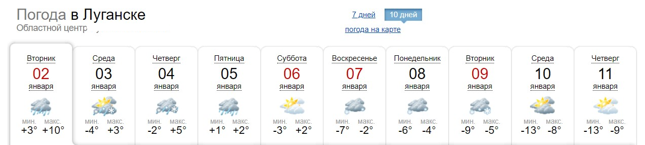Но и это не последние «хорошие» новости - согласно предварительному прогнозу, начиная с 10 января температура воздуха в Луганске и по Республике сильно снизится, ожидается до -13 градусов мороза ночью (ощущаться может как -19 из-за ветра). Утепляемся, пьём горячий чай и едим побольше фруктов с витамином С.