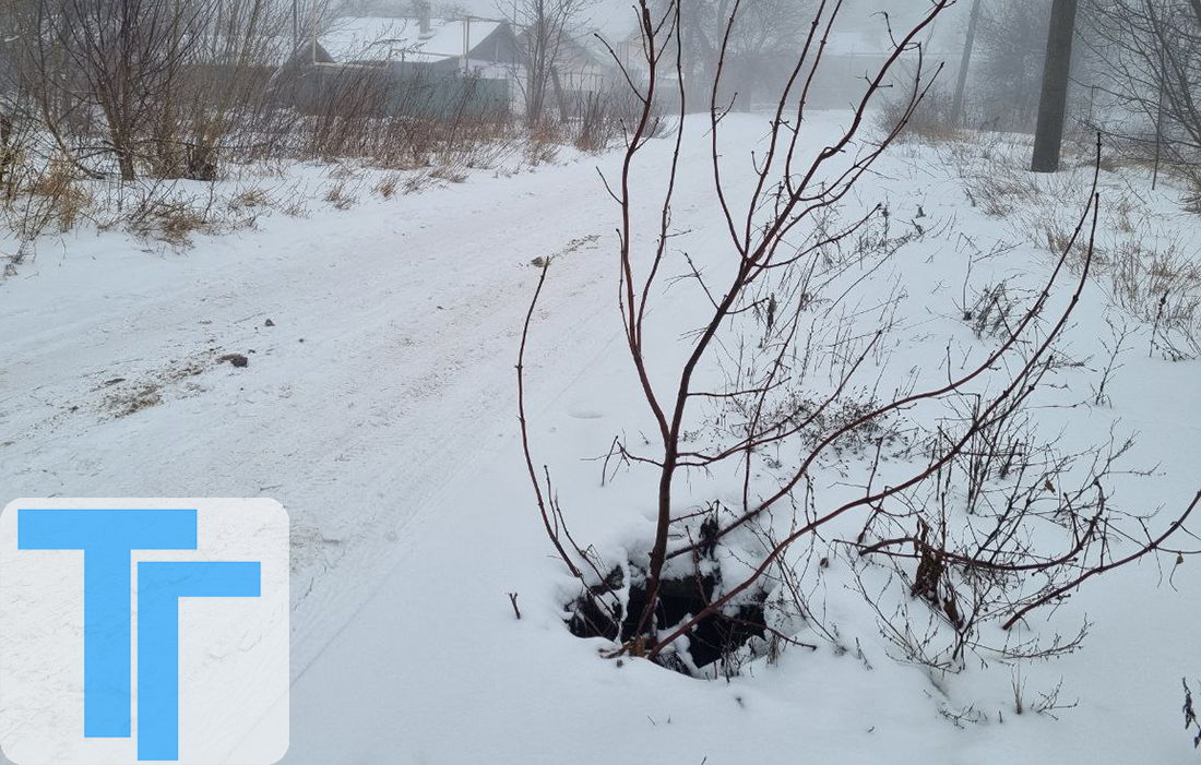 На перекрестке между трассой на улице Советской и дорогой к детскому саду расположилась реальная «черная дыра», диаметр отверстия которой неравномерно припорошило снегом. Из-за этого только с определенного ракурса угрозу хорошо видно. В нескольких метрах, предупреждая об опасности, торчат ставшие уже традиционными сухие ветки, которые определяют очередную яму.