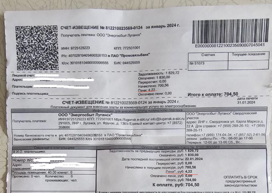 В конце прошлого года руководство «Энергосбыта» сообщало о том, что пени с людей брать не будут, но этот период завершился - уже для тех абонентов, которые не вовремя оплатили потреблённую электроэнергию за декабрь, новые квитанции за январь 2024 года пришли с начисленными пенями.