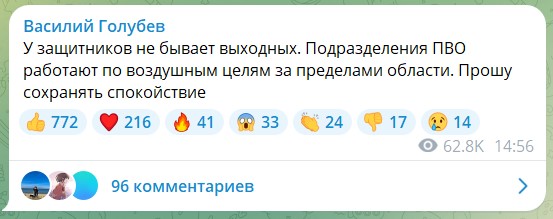 «У защитников не бывает выходных. Подразделения ПВО работают по воздушным целям за пределами области. Прошу сохранять спокойствие», - сообщил он.