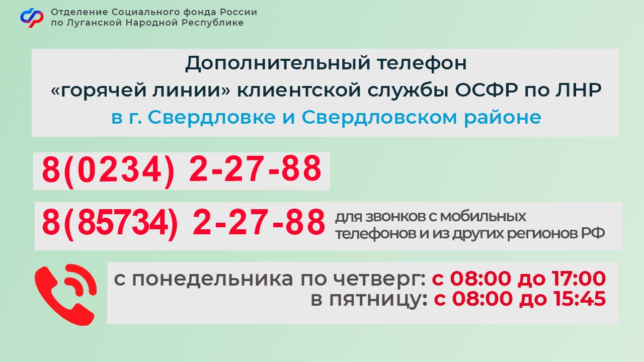 В клиентской службе Соцфонда России по ЛНР в Свердловске и Свердловском районе создан дополнительный телефон «горячей линии», по которому жители смогут обратиться за консультацией.