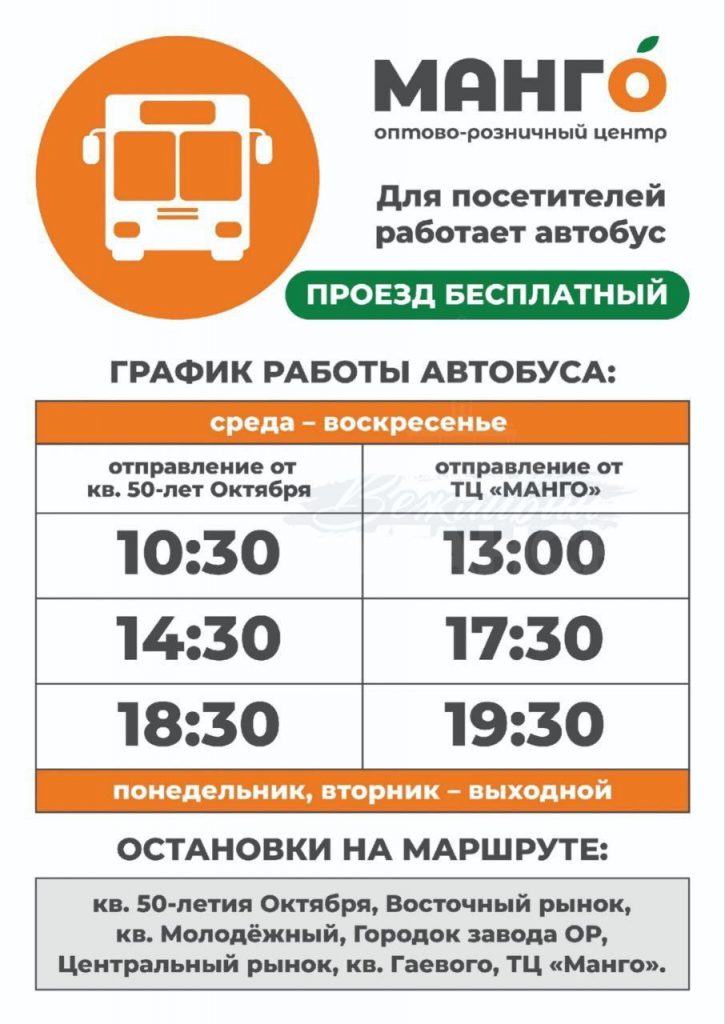 В пресс-службе отметили, что социальный автобус поменял график и маршрут движения. На пути следования от квартала 50-летия октября до «МАНГО» осуществляется только посадка пассажиров, а высадка осуществляется только на конечной остановке «МАНГО»