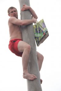 Как только догорел последний огонек, и пепел разлетелся по площади, все тут же направились к «столбу ловкости». Свердловские молодцы уже занимали очередь, кто же первым залезет на него. И вот он, первый герой, очень быстро забрался на самый верх, с гордостью снял пакет, и, не спеша, опустился вниз. Его примеру последовали и остальные ребята: один за одним, они только и успевали снимать пакеты с подарками (развешивали их дважды). Публика, наблюдая за сильными молодцами, не переставала аплодировать и выкрикивать слова поддержки!