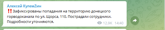 «Зафиксированы попадания на территорию донецкого горводоканала по ул. Щорса, 110. Пострадали сотрудники. Подробности уточняются», - написал он.