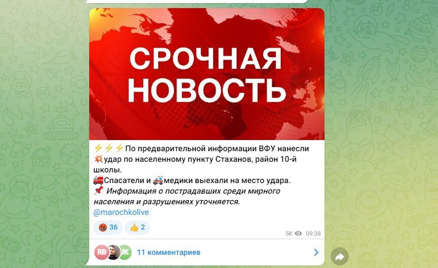 ВСУ нанесли удар по району 10-й школы Стаханова.