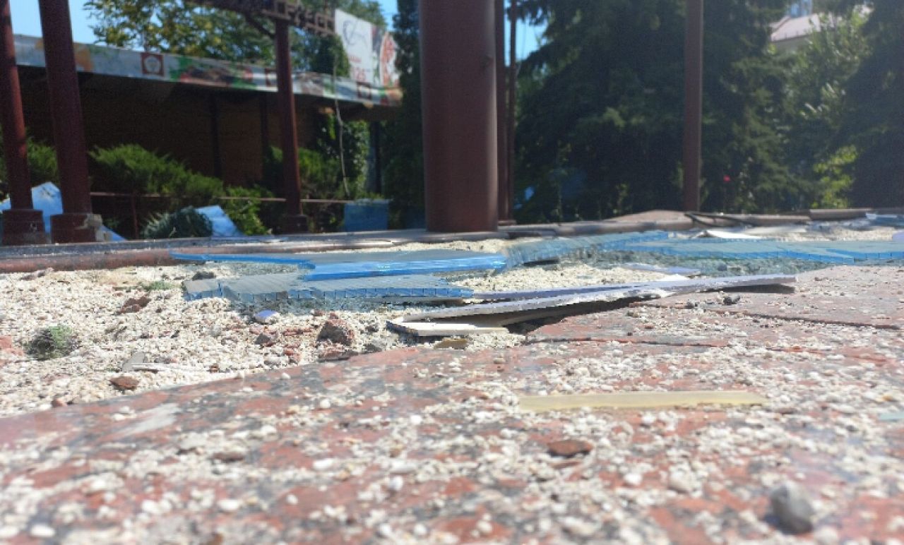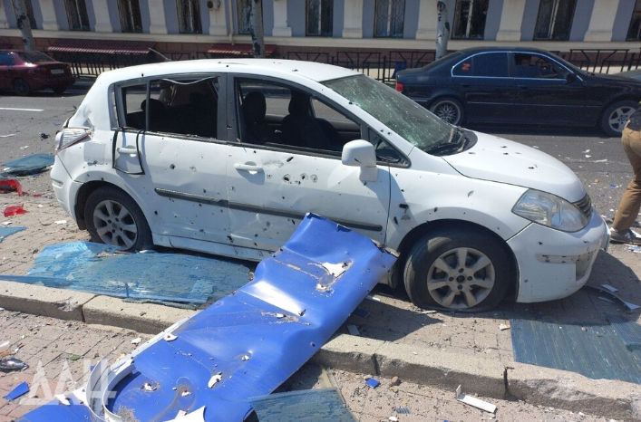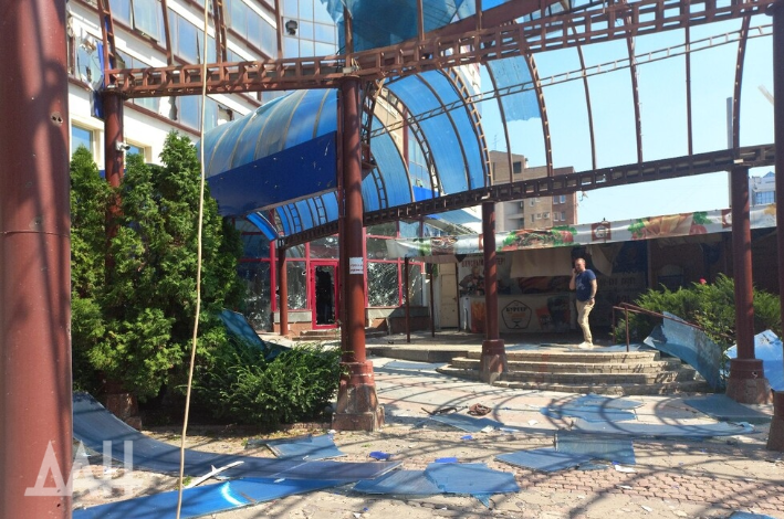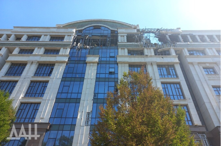 Снаряды попали в фасад, также пострадало правое крыло и верхний этаж. В здании начался пожар. В округе повсюду разбросан битый кирпич, части облицовки и металлоконструкций. Согласно предварительной информации, по центральной части Донецка выпустили от 4 до 6 снарядов.