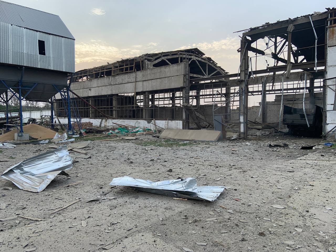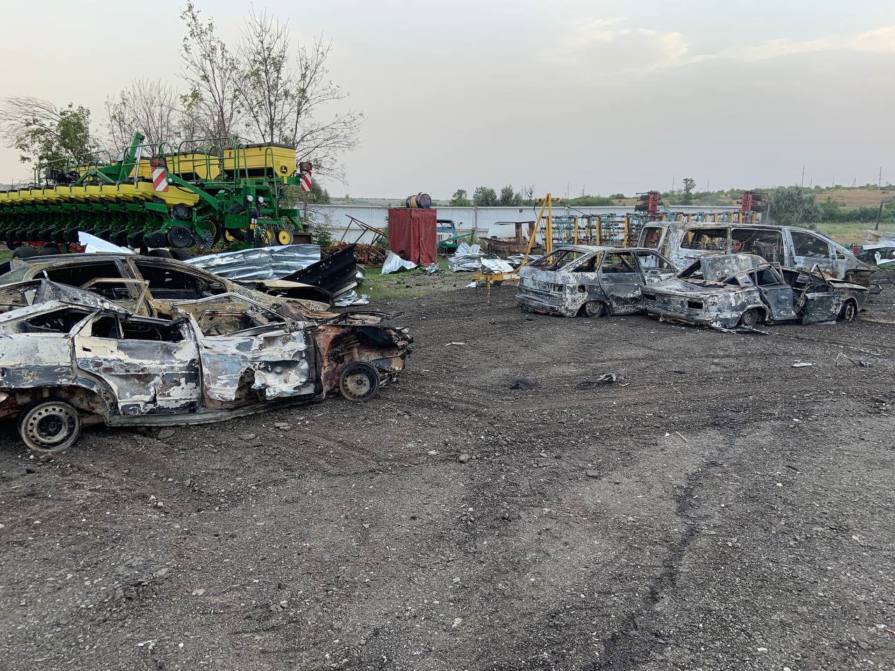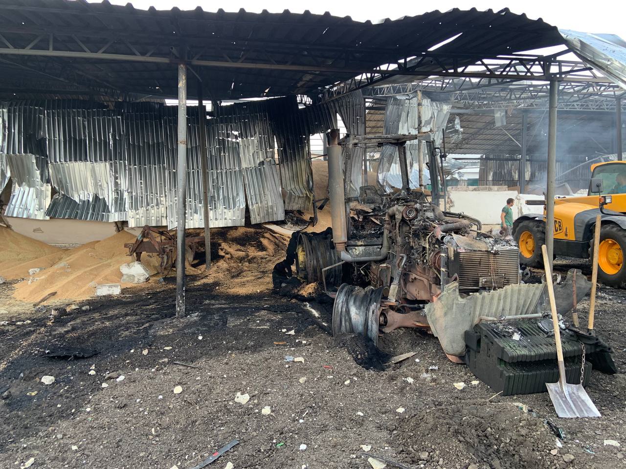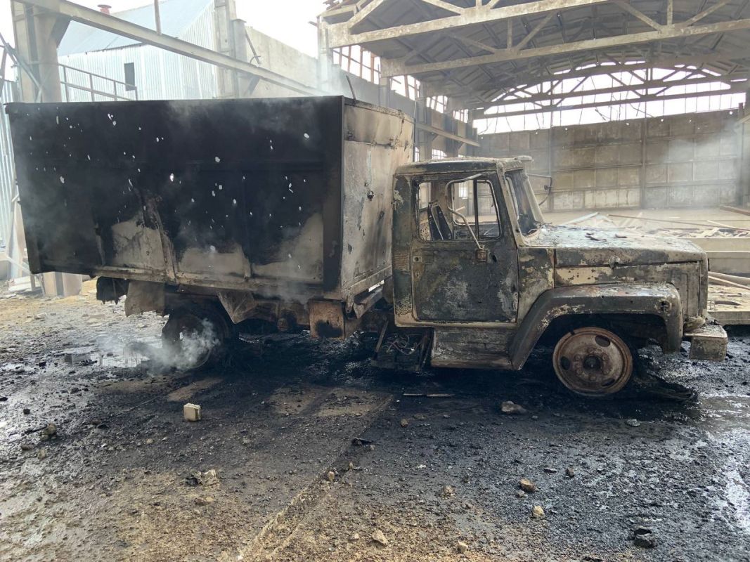 Огнем повреждены два легковых автомобиля, три автокрана МАЗ, крыши складов №2 и №1. Также уничтожено две единицы сельхозтехники, шесть легковых автомобилей, микроавтобус, крыши складов №1 и №3, три окна в административном здании.