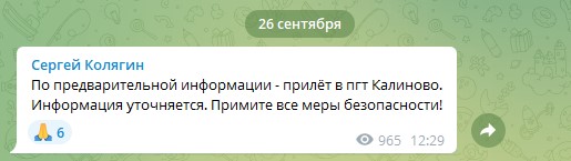 «По предварительной информации - прилёт в пгт Калиново. Информация уточняется. Примите все меры безопасности!» - написал Колягин.
