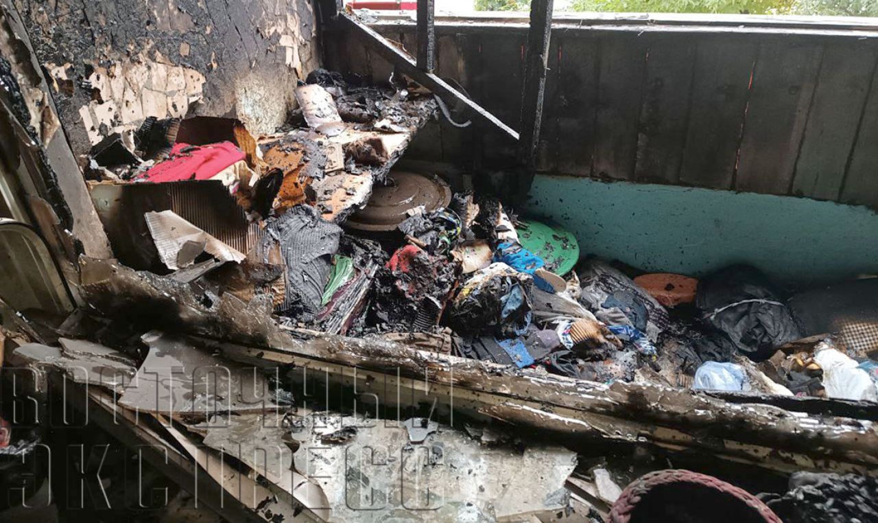 Огнем уничтожены домашние вещи. Повреждены балконный блок, рама и потолок. Предполагаемая причина – неосторожное обращение с огнем при курении неустановленных лиц.