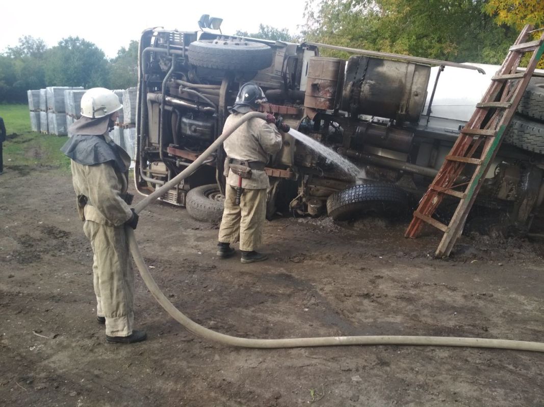 На территории средней школы №1 Кировского района перевернулся автобетоносмеситель Howo, из которого начало вытекать горючее.