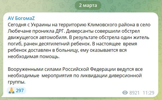 «Сегодня с Украины на территорию Климовского района в село Любечане проникла ДРГ. Диверсанты совершили обстрел движущегося автомобиля. В результате обстрела один житель погиб, ранен десятилетний ребенок. В настоящее время ребенок доставлен в больницу, ему оказывается вся необходимая помощь», - сообщил губернатор.