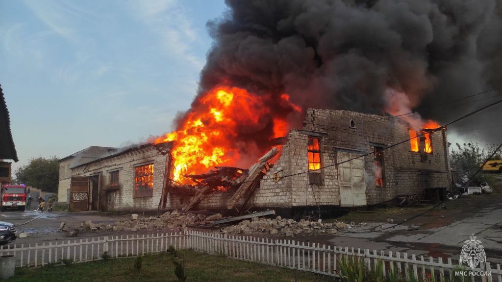 В результате пожара кровля склада полностью обрушилась, информация о пострадавших от сотрудников МЧС не поступала.