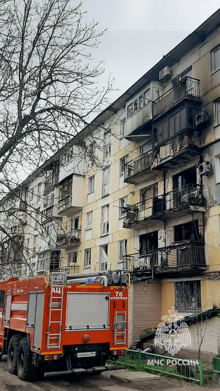 На место обстрела прибыли дежурный караул 76-й пожарно-спасательной части, который стал тушить четыре балкона квартир в 5-этажном доме.