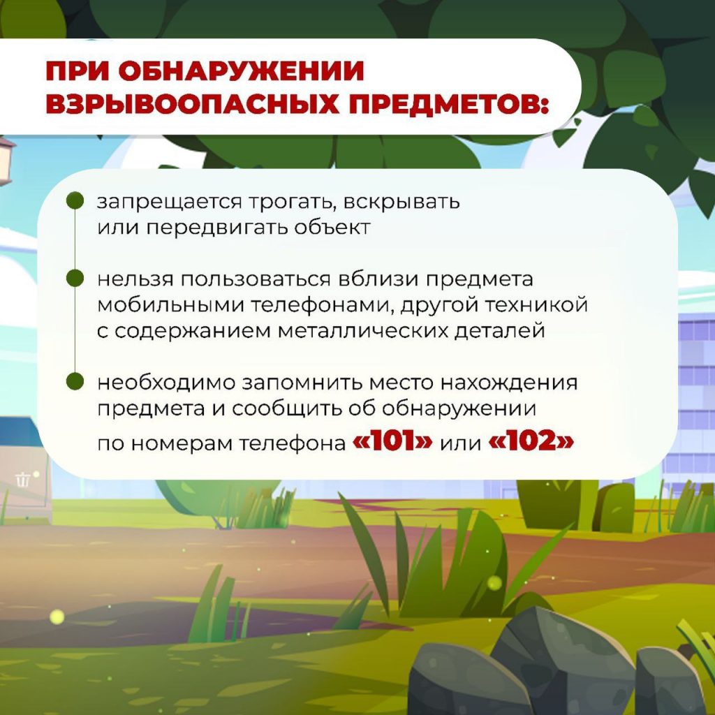 Пресс-служба МЧС подготовила памятки для жителей Республики с информацией о том, как вести себя при обнаружении взрывоопасного предмета.