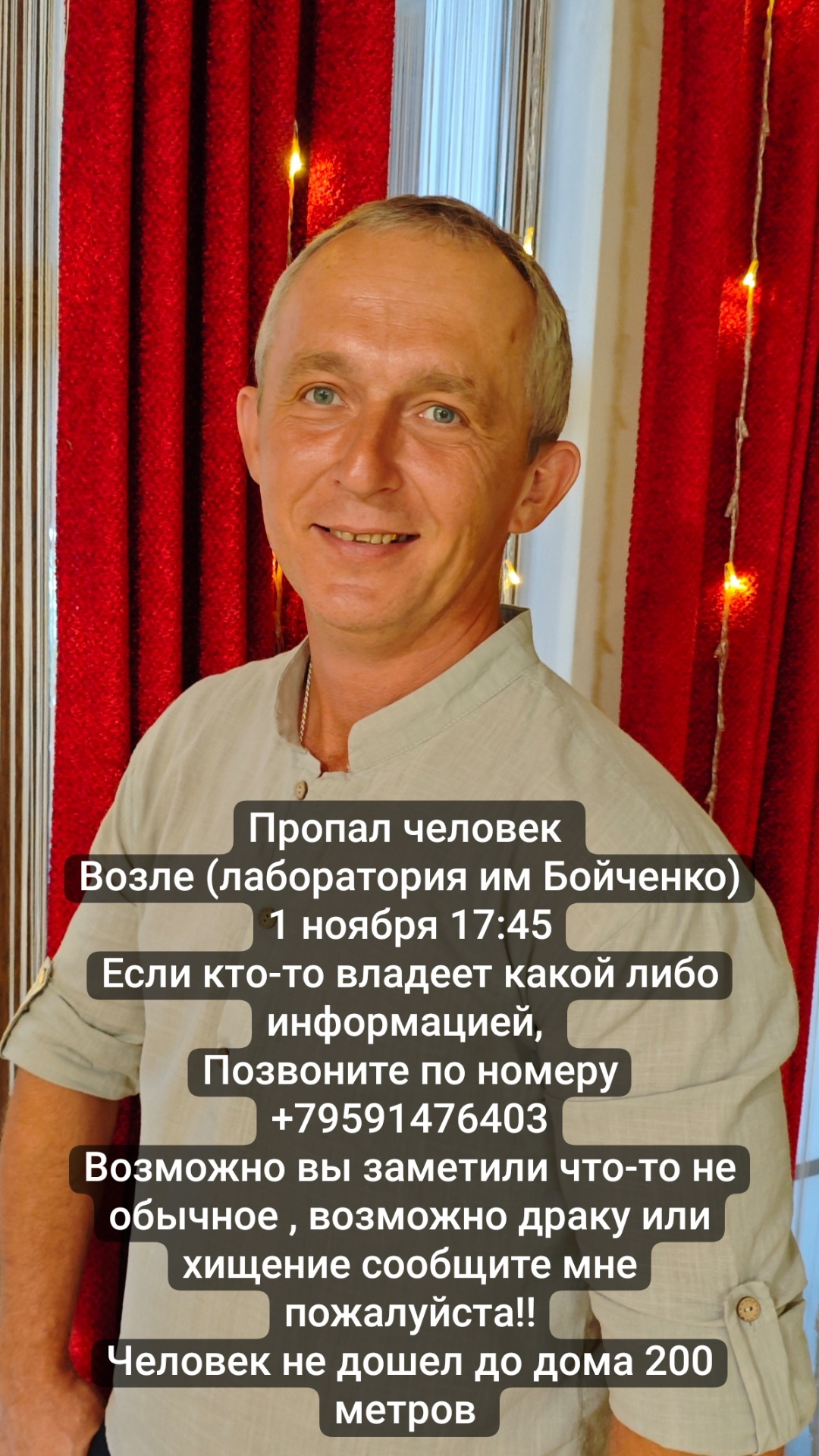 Если кто то владеет информацией или видел, слышал, звуки драки или крики, или чт- то подобное, сообщите по номеру +7959 147 64 03 - Анастасия.