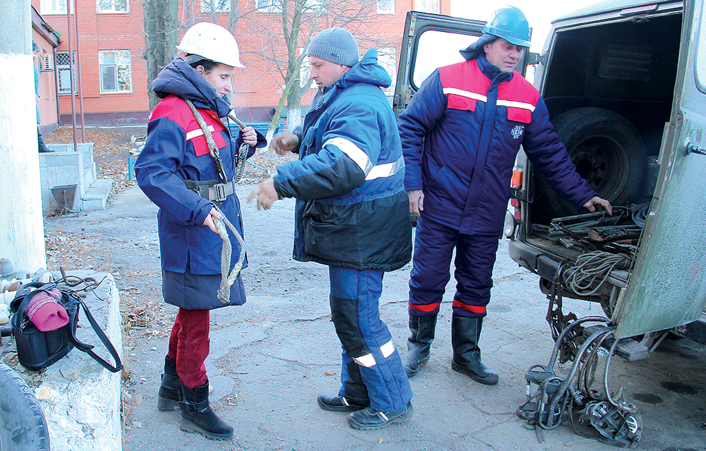 Сначала нам показывают огромную, на всю стену мнемосхему, на которой отражена вся распределительная система. Первым делом мы с коллегой стали искать трансформаторные подстанции, от которых запитаны населенные пункты, где мы проживаем. Если Оля отыскала «себя» сразу в правой верхней части, то я долго бегала вдоль стены, заглядывая вверх-вниз, и была вынуждена прибегнуть к помощи специалистов, и только после этого у самого пола нашла ТП 200. Диспетчер все эти точки знает наизусть. А тем временем Оля уже принимает звонки, и оперативно-выездная бригада в лице электромонтера Сергея Ткачука и электрика-водителя Алексея Костенко собираются на линию. Они уже прошли медкомиссию, где специалисты проверили их на трезвость. Нам поверили на слово, потому что без спецдопуска нам было отведено место в «зрительном зале», но позволили получить обязательные защитные средства - мне вручили уровень напряжения, и доверили проверку диэлектрических перчаток на целостность, ведь даже самые незначительные повреждения могут угрожать жизни. Я сворачиваю резиновые изделия в трубочку, и они слегка надуваются. Значит, все в порядке. Нам выдают спеоцодежду, и с бригадой мы выезжаем на линию в пос. ш.1/2 и кв. Пролетариата Донбасса. По дороге нам показывают деревья, вросшие в провода, которые при обрыве добавляют еще полтора часа работы, и я судорожно вспоминаю, в каком состоянии находится мой сад.