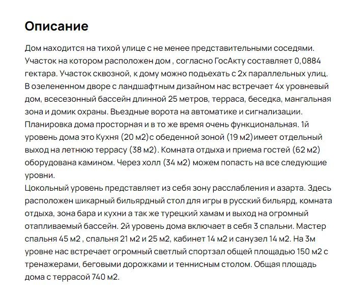 Коттедж общей площадью 740 кв. метров расположен на участке в 9 соток. Дом включает четыре этажа, цокольный уровень с зоной отдыха, несколько жилых этажей и большой спортивный зал.