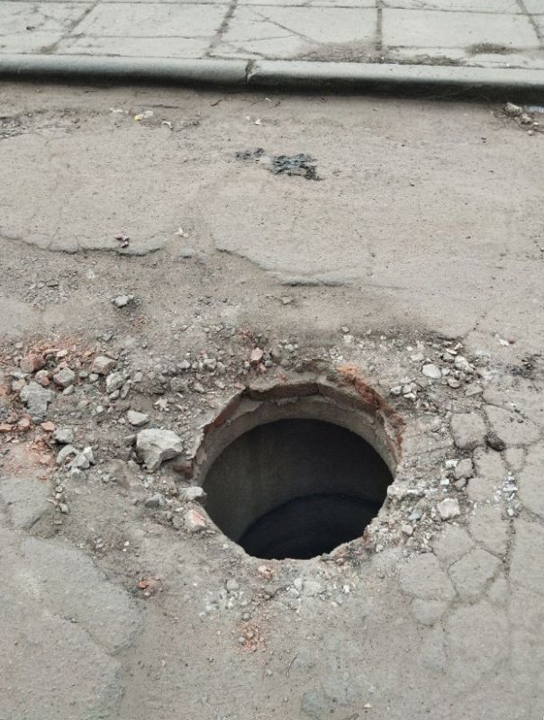 «Луганск, центр, возле ЖК Дружба. Одного люка нет, второй держится на честном слове. Такая ситуация примерно месяц.»