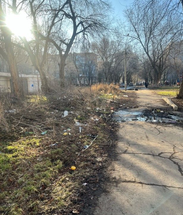 «Уберите мусор вдоль дома кв.Якира,3 напротив 8-9 подъездов,ветки с 2023 года лежат,банки бутылки и течь холодной воды никто год не устраняет,тротуар залит весь.»